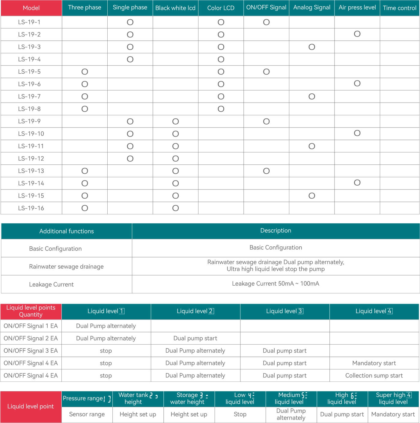 · Optional liquid level control method: Float switch/analog liquid transmitter 4~20mA or 0~5V